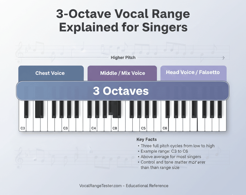 A 3 octave vocal range means a singer can sing across three full octaves, which is wider than average and considered strong for most vocalists. It allows greater flexibility across low, mid, and high notes, useful for versatile singing styles.
