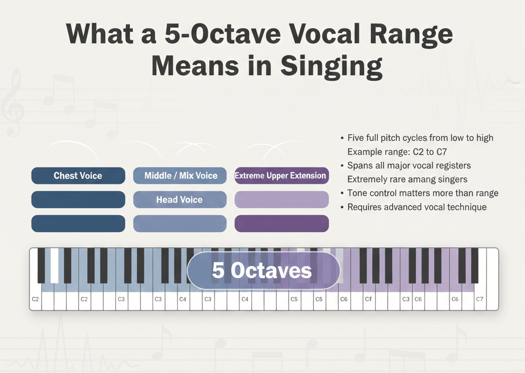 A 5 octave vocal range means a singer can span five full octaves, an extremely rare and elite ability. It allows access to very low, mid, and ultra-high notes, exceeding most professional singers and enabling exceptional vocal versatility.
