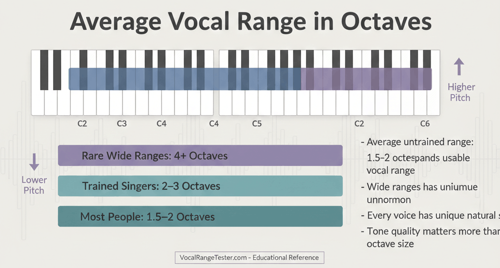 The average vocal range is about 1.5–2 octaves for most people, while trained singers typically reach 2.5–3 octaves. Professional vocalists may exceed 3–4 octaves, though tone quality and control matter more than total range.