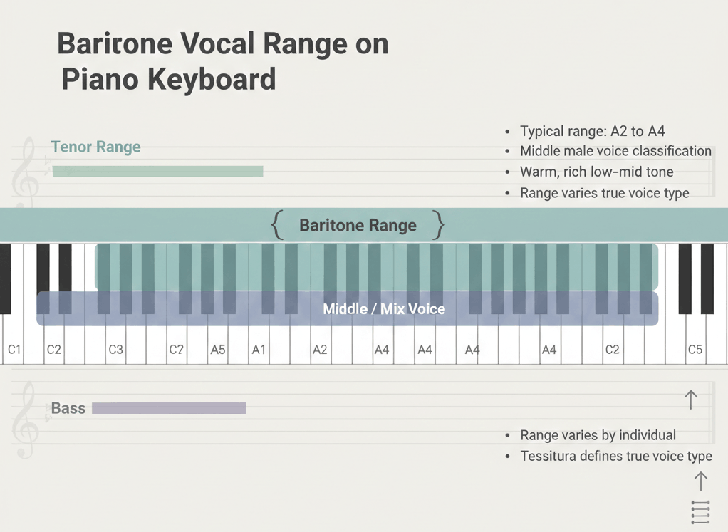 A baritone vocal range is a male voice type between tenor and bass, typically spanning A2 to A4. It features a warm, rich, and powerful tone, offering strong low notes, balanced mids, and versatile expression across classical, pop, and contemporary music.