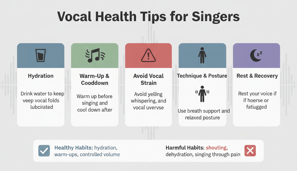 Vocal health tips for singers include staying hydrated, warming up before singing, avoiding strain and yelling, resting your voice regularly, and maintaining good posture and breath support. Consistent care helps protect vocal cords, improve tone, and extend singing longevity.