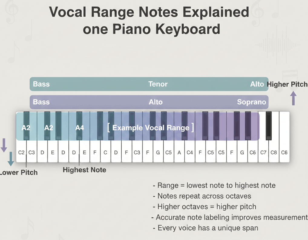 Vocal range notes are the lowest and highest pitches a person can sing comfortably, such as C3–C5 or F3–F5. They define your total singing range, help determine your voice type, and guide you in choosing songs that fit your voice.