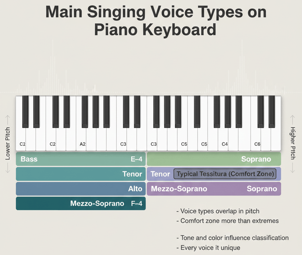 Voice types describe how a voice naturally functions based on comfort, tone, and tessitura—not just pitch.